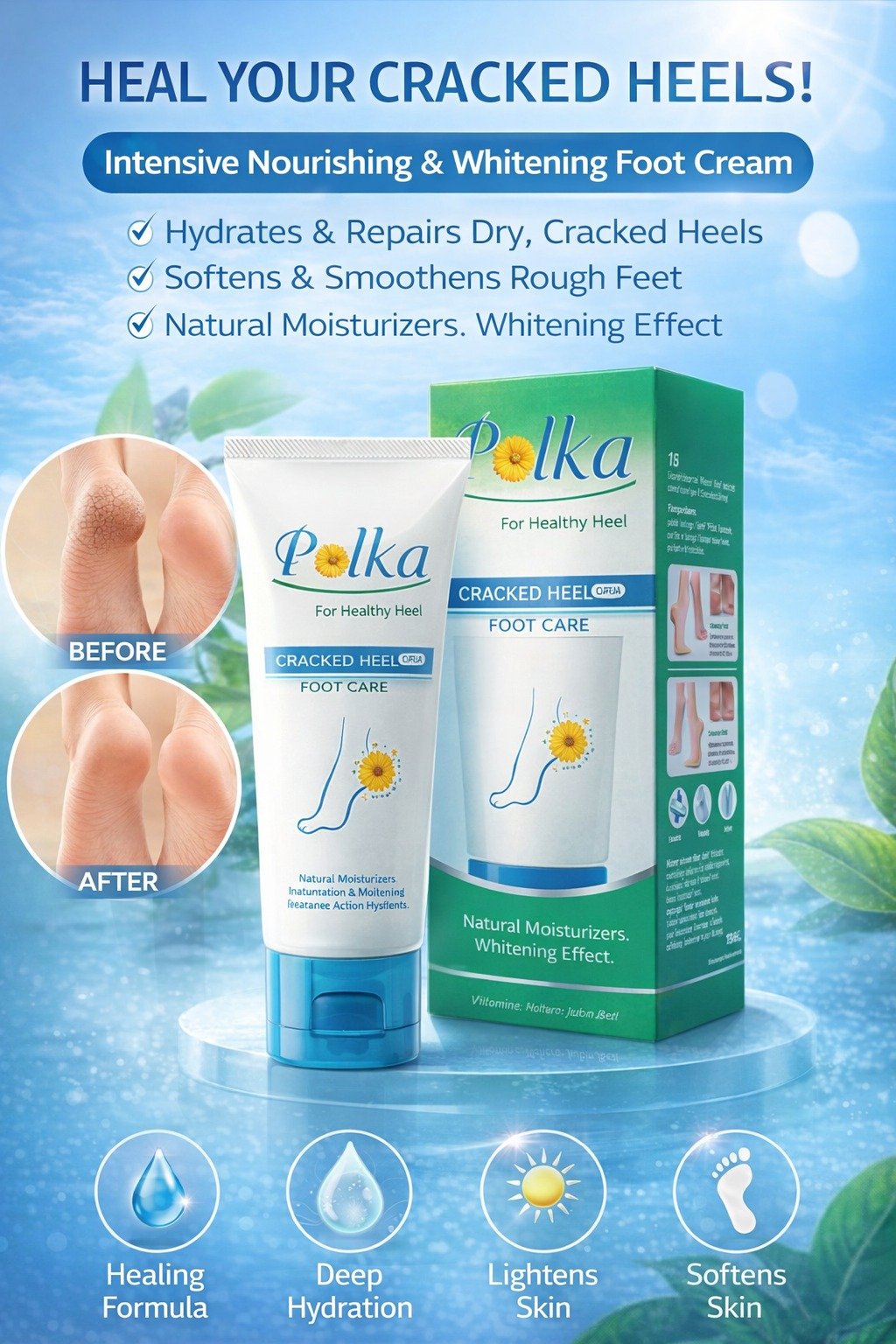 Polka Cracked Heel Cream is specially formulated to repair cracked heels and deeply moisturize dry, rough feet. Its rich, fast-absorbing formula helps soften hard skin, heal heel cracks, and restore smooth, healthy-looking feet with regular use.